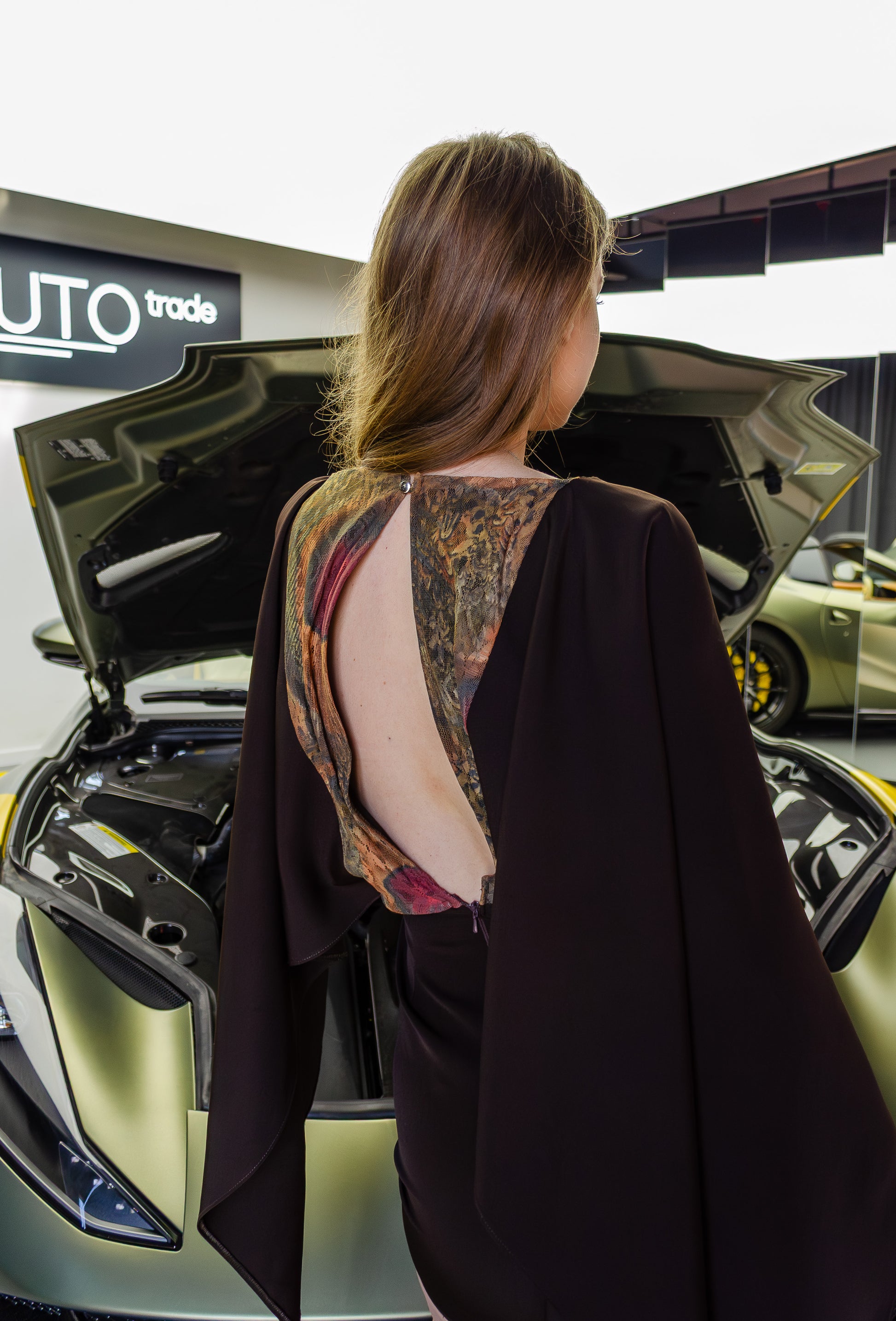 Rochia AMEA impresionează prin nuanța sa caldă de maro, însă elementul central este dantela spectaculoasă de pe spate, care atrage privirea și adaugă o notă intensă de eleganță. Decupajul amplu al spatelui completează perfect acest detaliu, oferind o apariție rafinată și subtil senzuală.