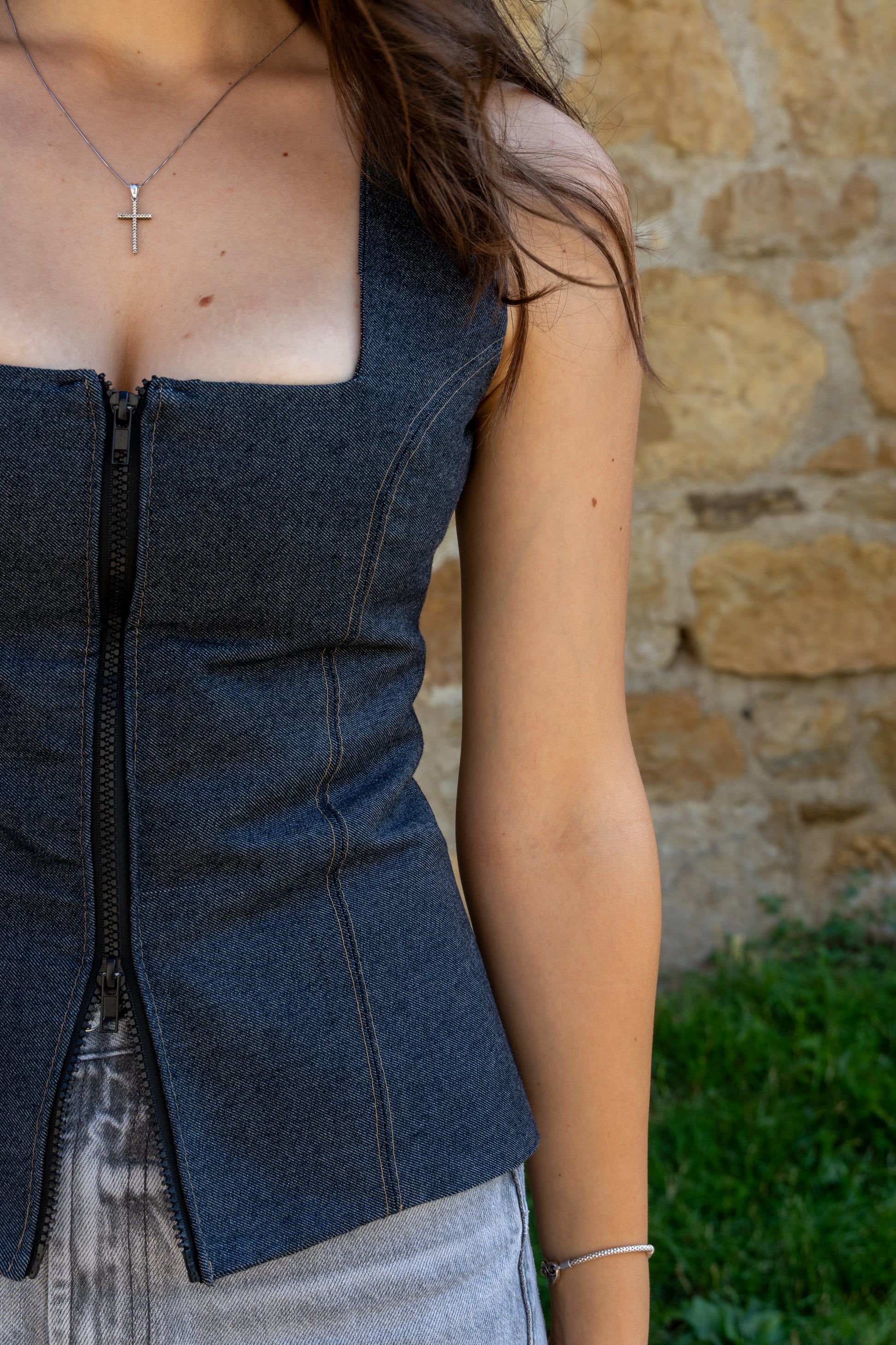 Topul TWIN, din denim, combină stilul modern cu versatilitatea zilnică. Croiala sa ajustată se mulează frumos pe corp, oferind confort pe tot parcursul zilei. Denim-ul de calitate conferă rezistență și un look casual-chic, potrivit pentru diverse ocazii, de la plimbări relaxate la ieșiri elegante.